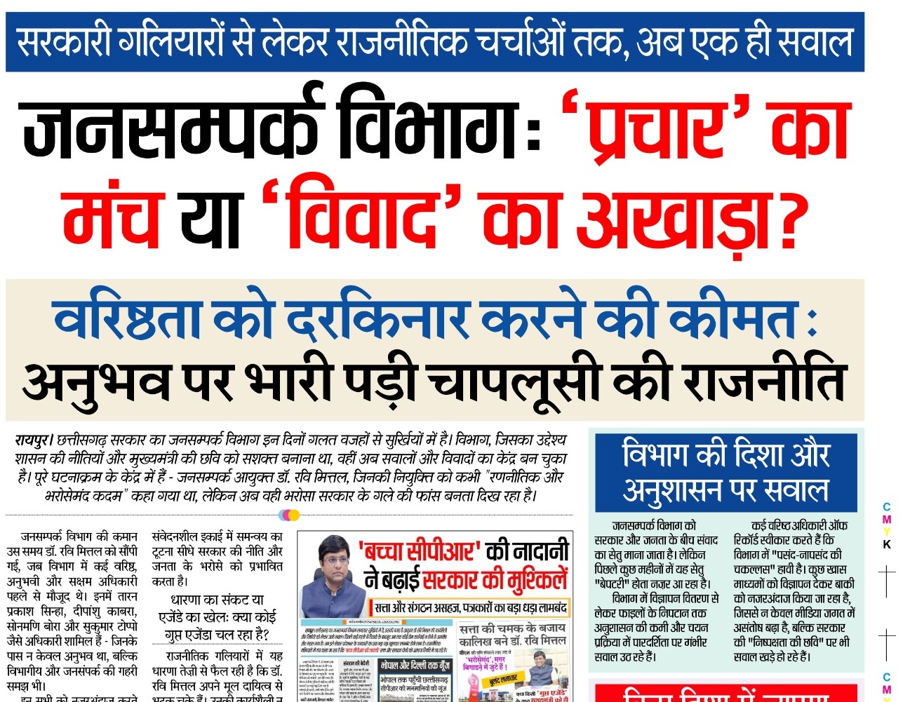 रायपुर : छत्तीसगढ़ सरकार का जनसम्पर्क विभाग इन दिनों गलत वजहों से सुर्खियों में है। विभाग, जिसका उद्देश्य शासन की नीतियों और मुख्यमंत्री की छवि को सशक्त बनाना था, वहीं अब सवालों और विवादों का केंद्र बन चुका है। पूरे घटनाक्रम के केंद्र में हैं – जनसम्पर्क आयुक्त डॉ. रवि मित्तल, जिनकी नियुक्ति को कभी “रणनीतिक और भरोसेमंद कदम” कहा गया था, लेकिन अब वही भरोसा सरकार के गले की फांस बनता दिख रहा है।